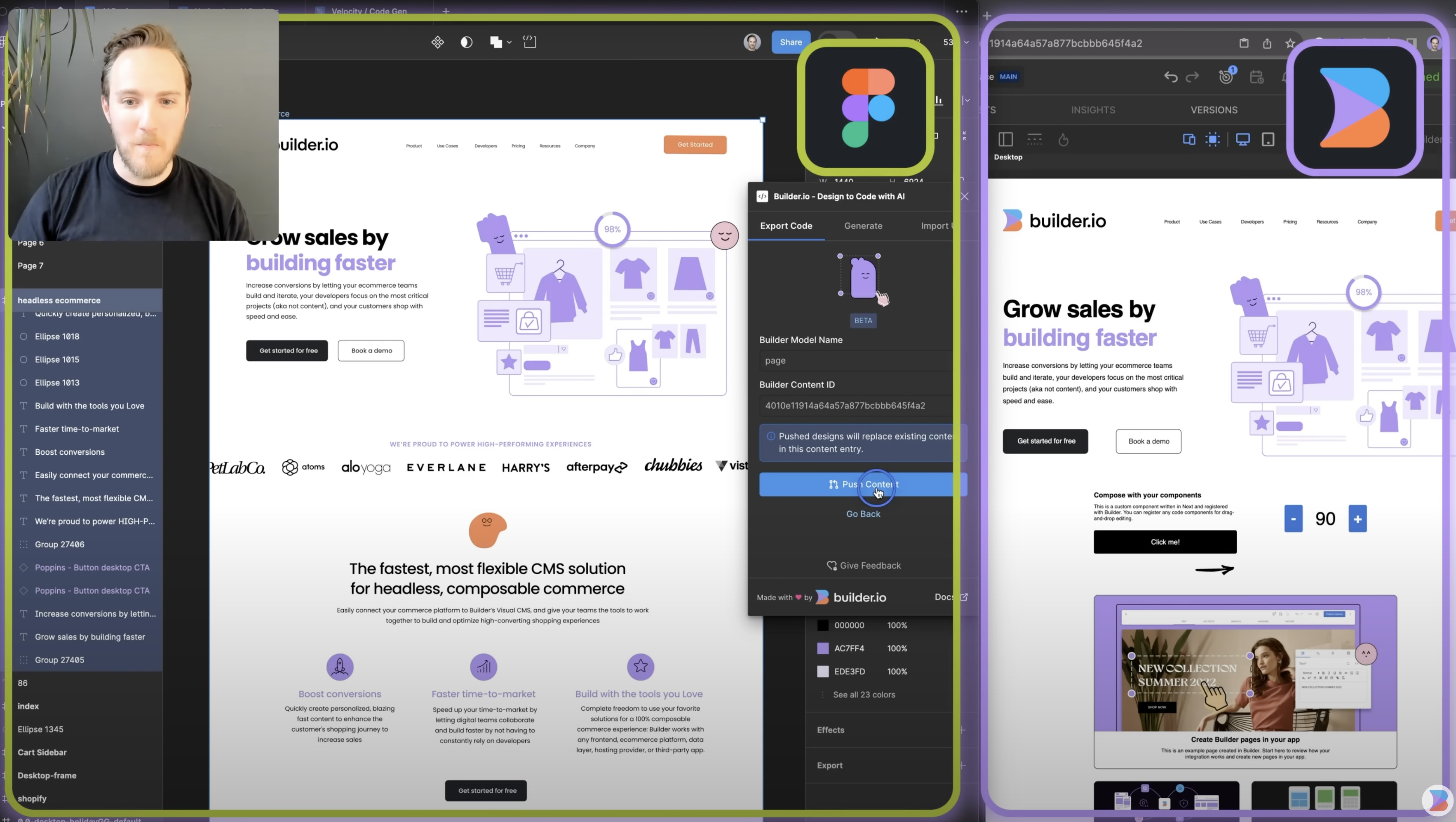這個功能想做到當你未來 Figma 設計稿有修改時,只要將修改部分框起來,點擊如圖上的「Push content」按鈕,就能同步到既有的 Builder.io CMS 上,接著點擊發佈按鈕,就可把調整部署到正式網站上。
