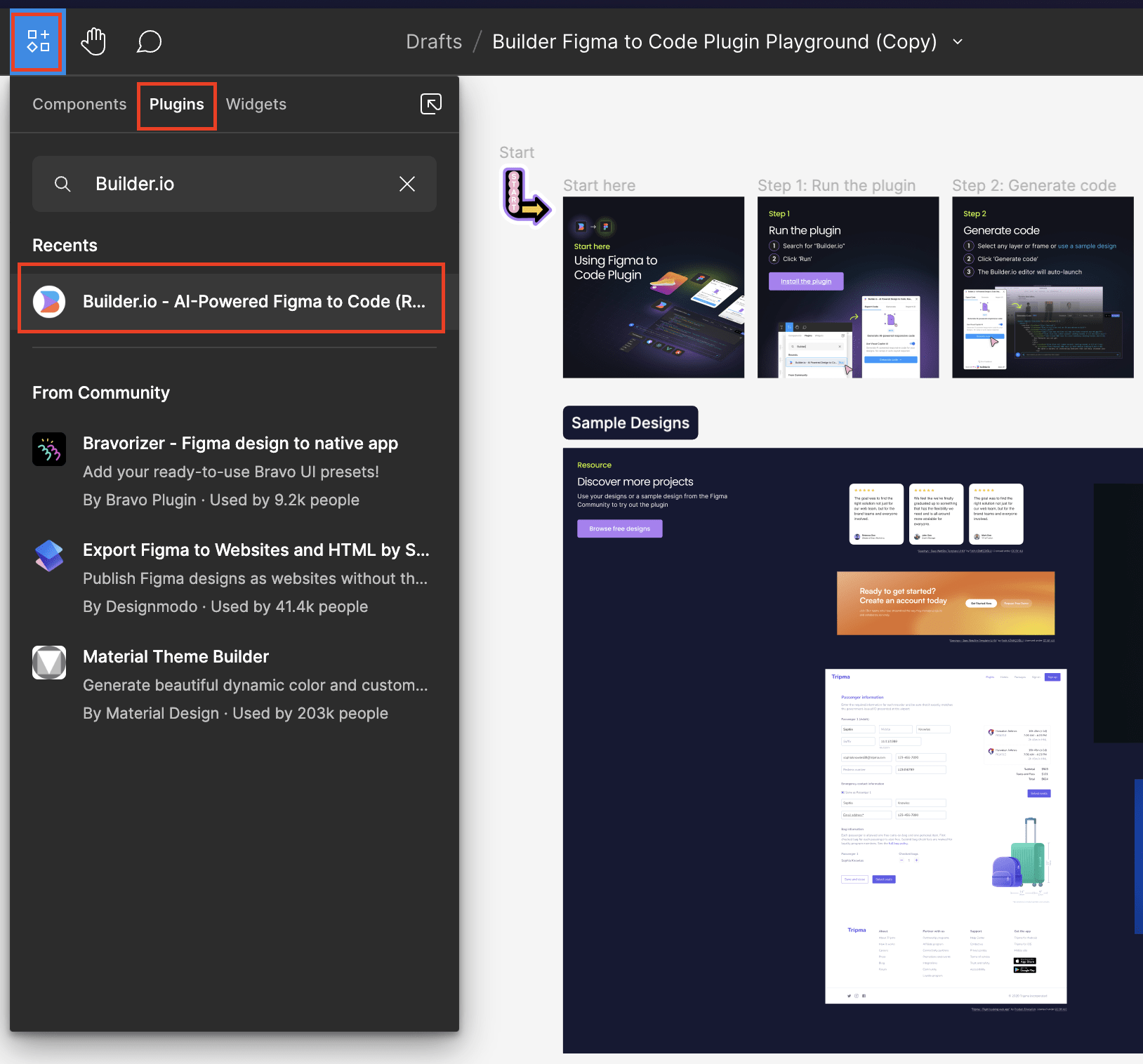 這裡先點擊左上角像 PS4 的 icon(或可用快捷鍵 shift + i 開啟),選到 Plugins tab,在搜尋框搜尋找到 Builder.io - AI-Powered… 點擊打開 plugin: