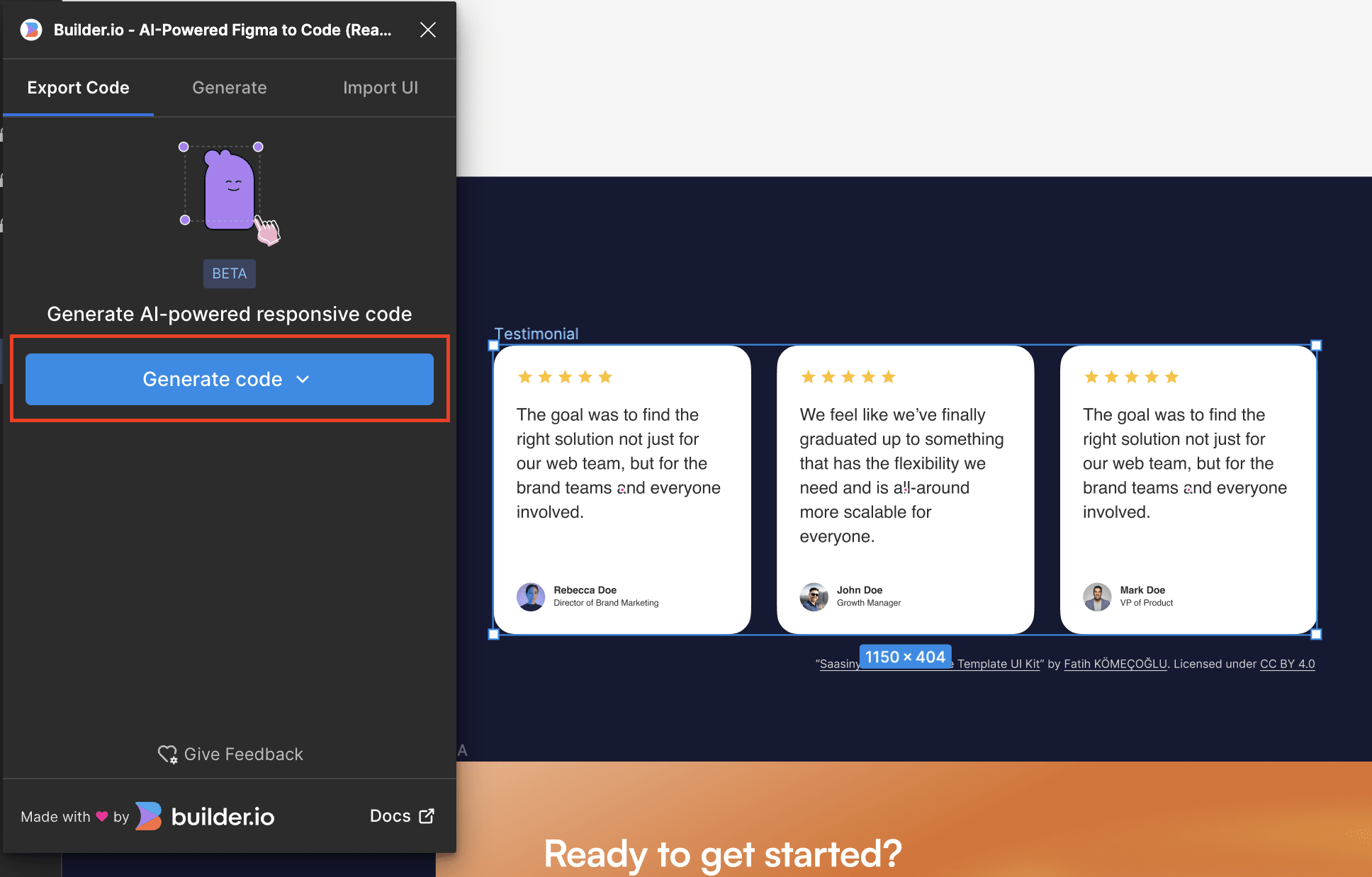 我們挑選下方的 Sample Designs 中的「Testimonial」這個區塊,並按下「Generate code」: