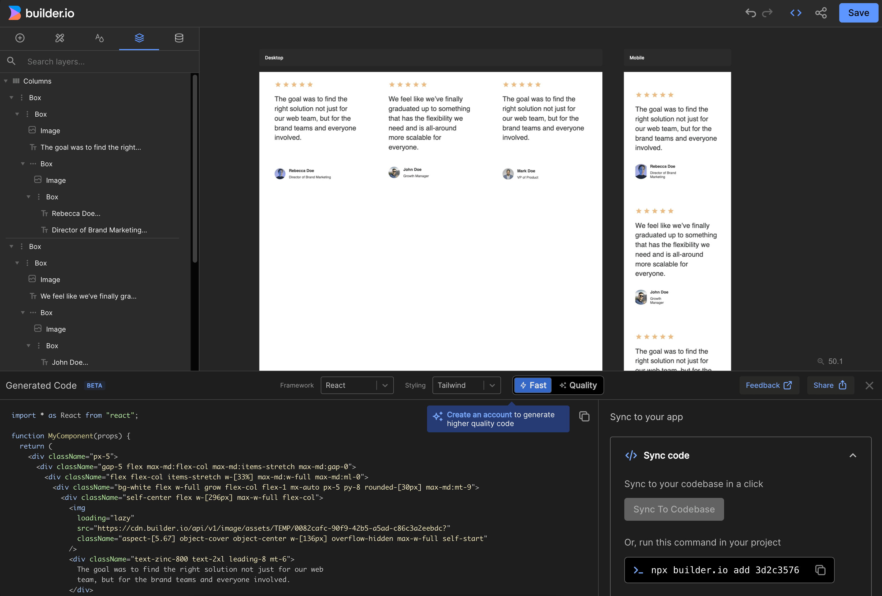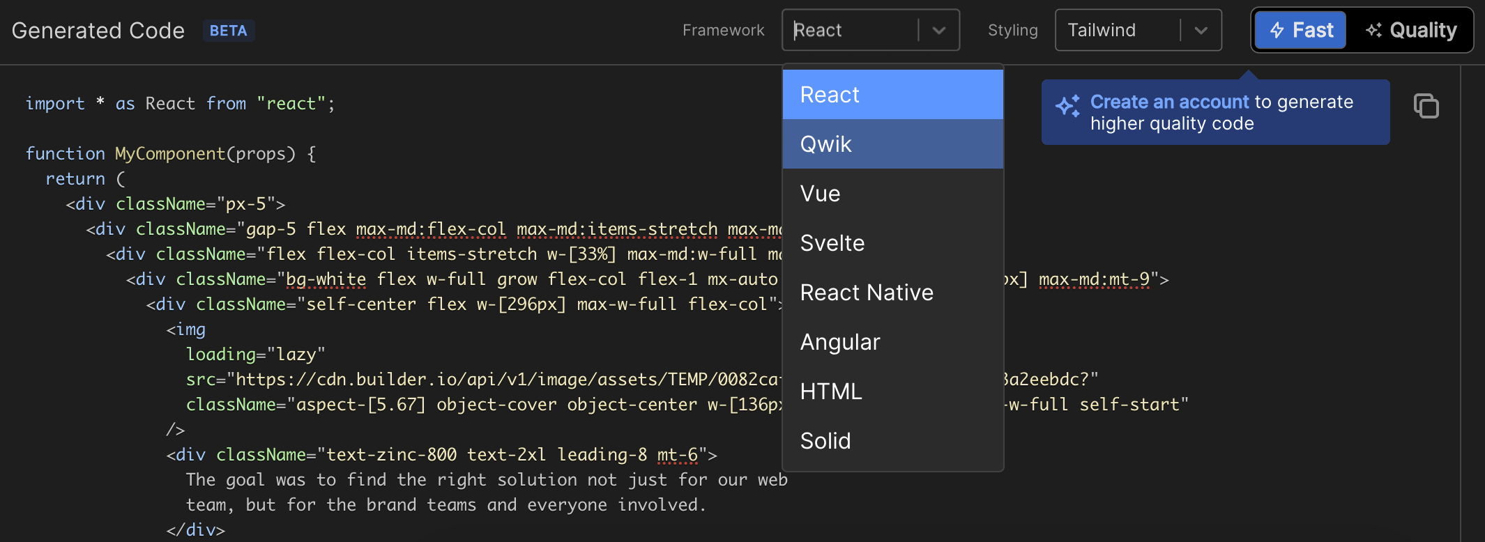 在下方的 Framework 及 Styling 上就如前述可以切換你喜好的框架及樣式工具,而一旁還有個 Quality 的 switch bar,這個功能需要你註冊並登入一個 Builder.io 的帳號: