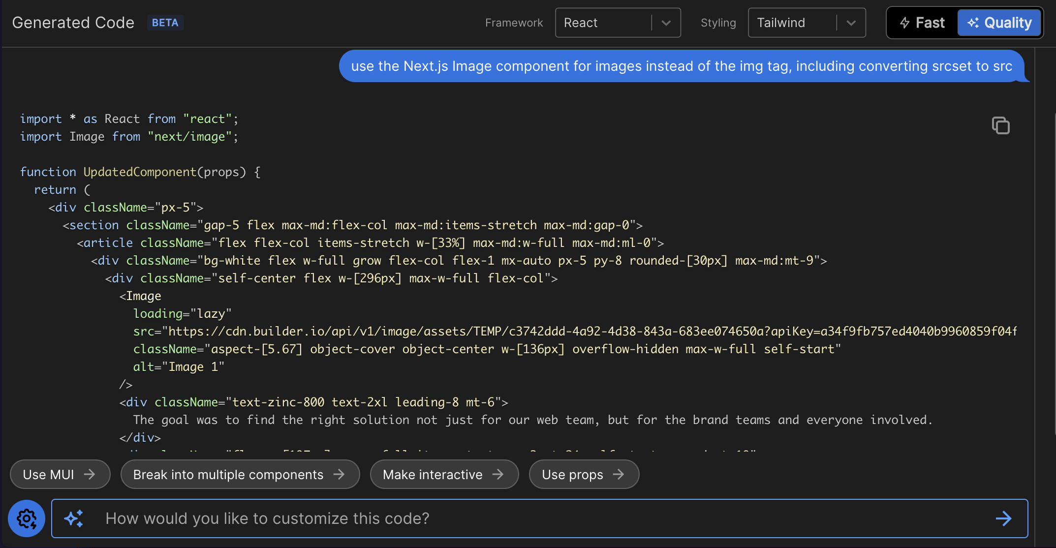 等待幾秒鐘後會跳轉至 Builder.io 的 space 頁面,這裡你可以看到 Visual Copilot 自動將設計稿輸出成 desktop、mobile 版本的前端框架程式碼: