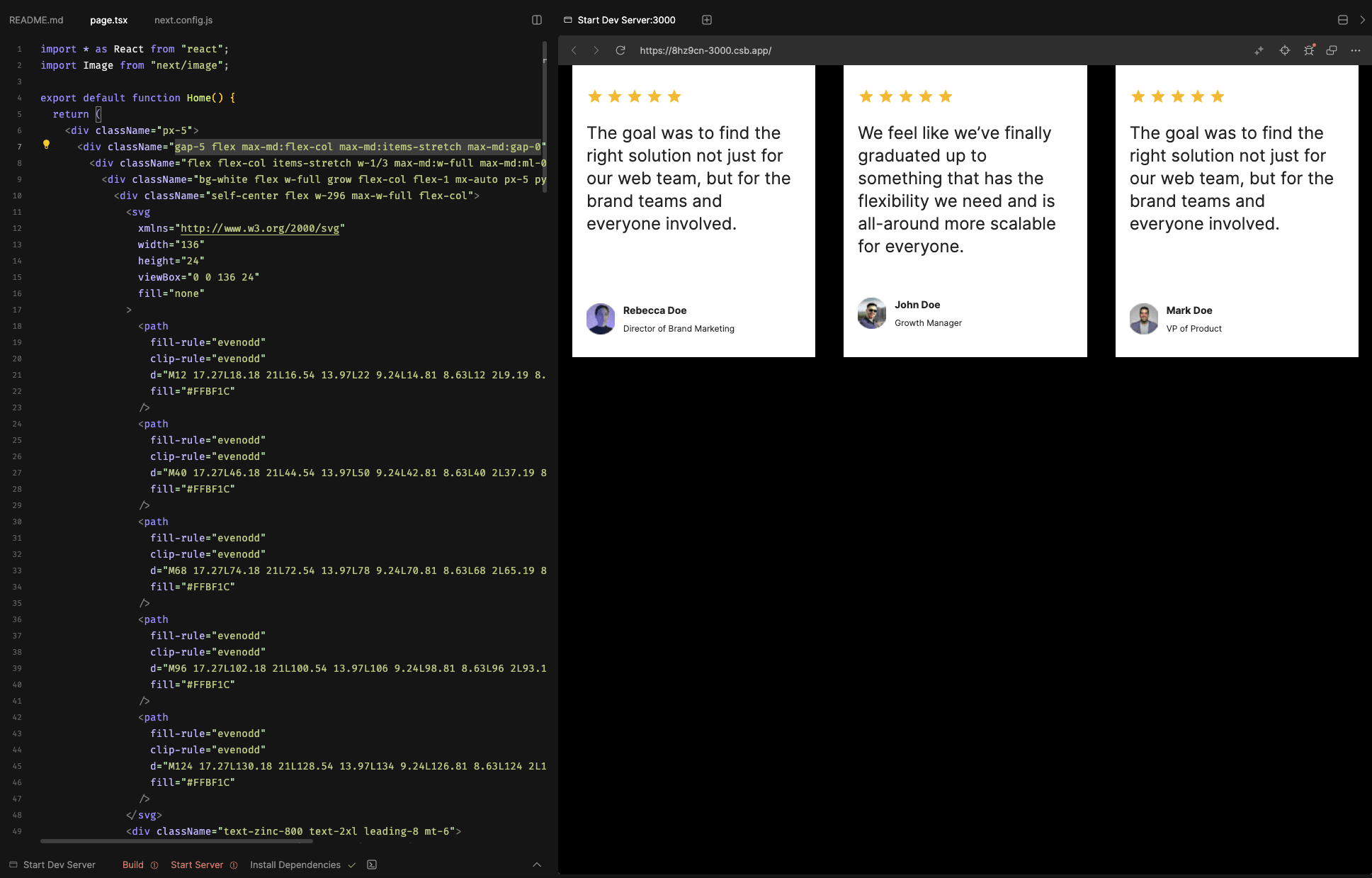 我們將上述這段程式碼貼到 CodeSandbox 上的 Next.js v14 template 試試效果,將產出的內容貼到 app/page.tsx 底下,另外在 next.config.js 中加上圖片網域的設定: